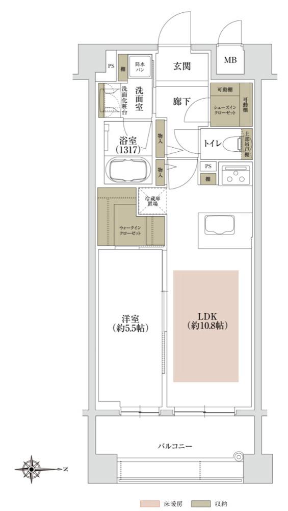 - バス・トイレ別 / 洗濯機置き場 / 給湯 / カウンター付キッチン / 対面式キッチン / システムキッチン / 食器洗浄乾燥機 / ウォークインクローゼット / フローリング / バルコニー / オートロック / 床暖房