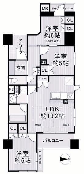 - LDK13.2帖 洋室5帖 洋室6帖 洋室6帖