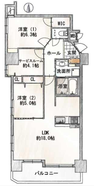 - LDK18帖 洋室5帖 洋室6.3帖 S4.1帖