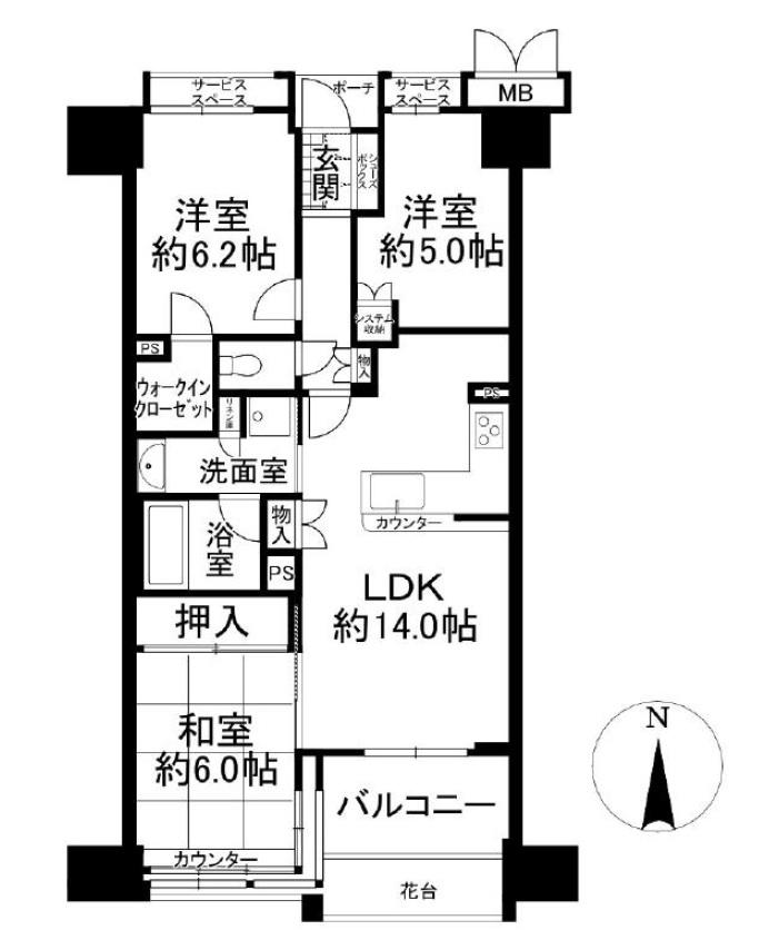 - LDK14帖 洋室5帖 洋室6.2帖 和室6帖