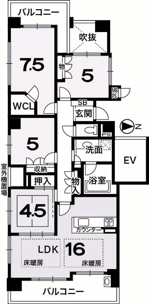 - LDK16帖 洋室7.5帖 洋室5帖 洋室5帖 和室4.5帖